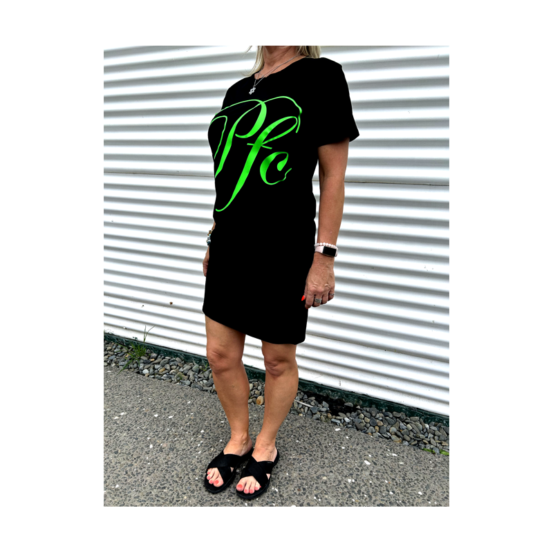 Our PFC Calli Fluoro print comes on a Global Organic Textile Standard certified organic short sleeve dress with print available in Fluoro Orange, Pink, Green, Yellow or standard White. Either kicks or heels both go well with this dress so you can wear it your way!!