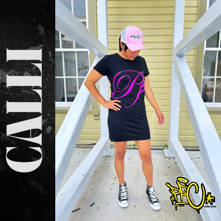 Our PFC Calli Fluoro print comes on a Global Organic Textile Standard certified organic short sleeve dress with print available in Fluoro Orange, Pink, Green, Yellow or standard White. Either kicks or heels both go well with this dress so you can wear it your way!!