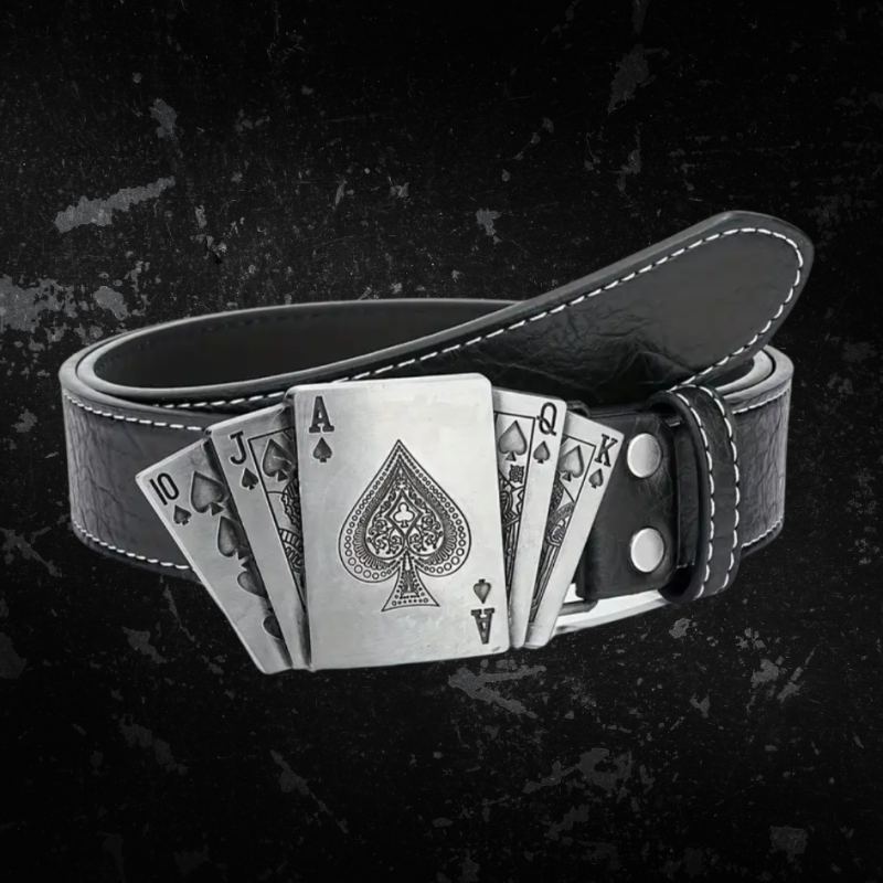 Play your style hand with the Royal Flush Buckle Belt. Made from durable PU leather, it features a metal buckle inspired by the iconic royal flush, adding a bold, statement-making edge to any outfit.